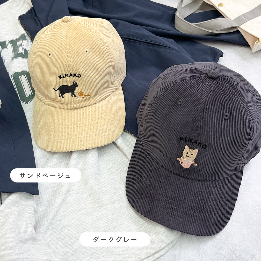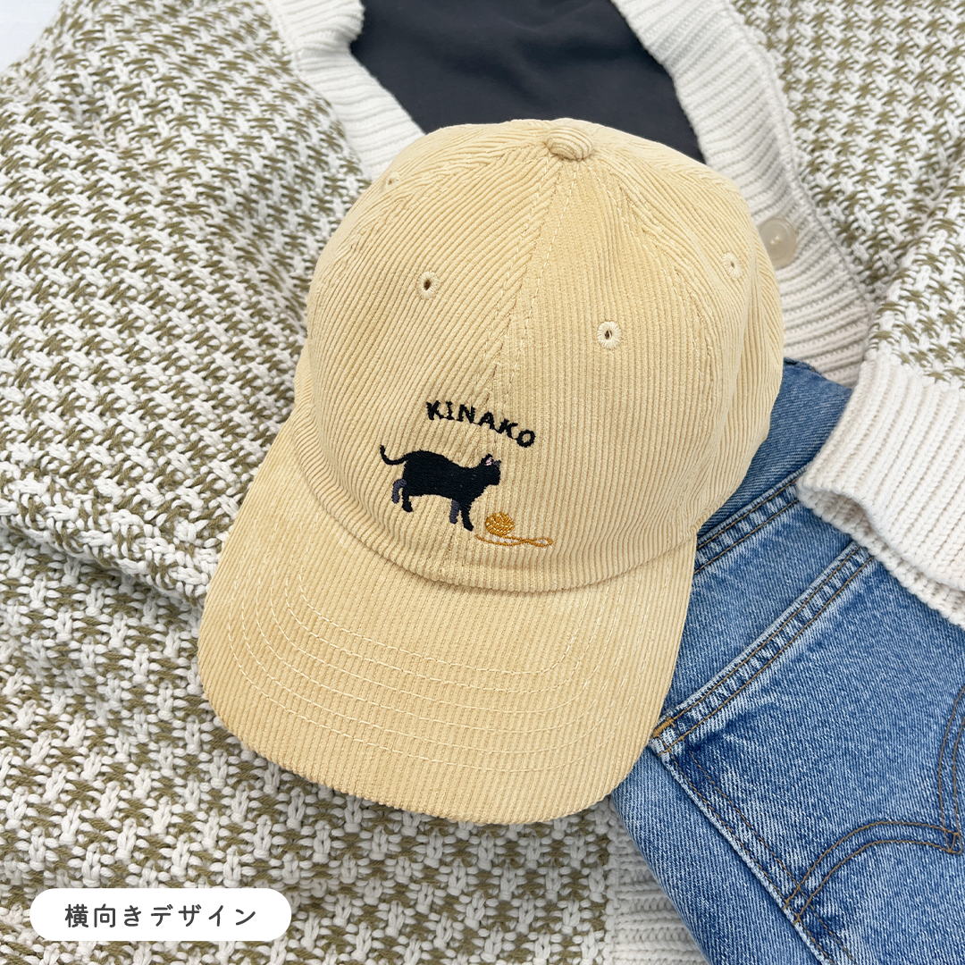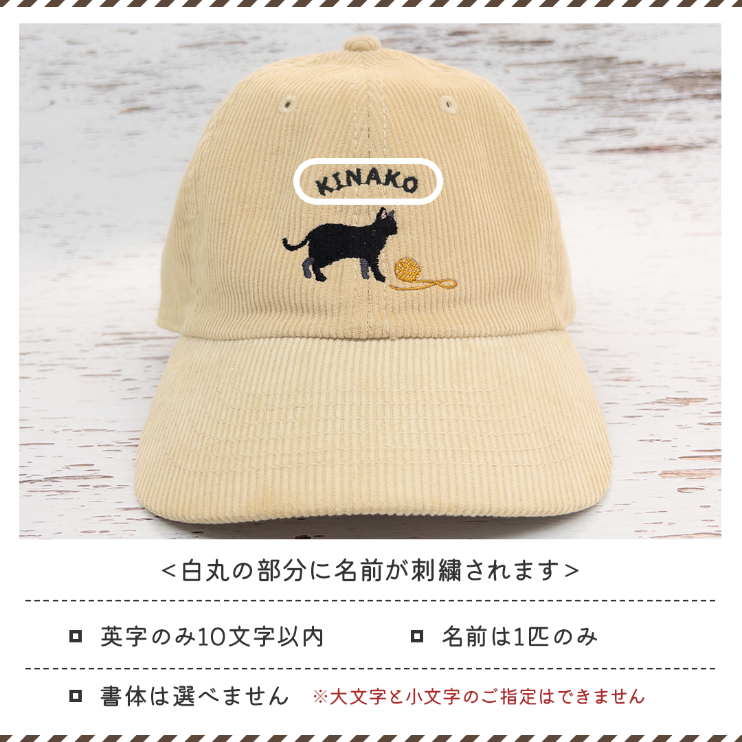 このキャップは、愛猫の名前やご自分のお名前を無料で刺繍できます。